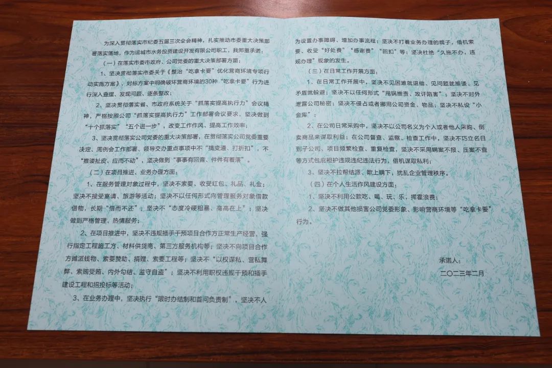 會(huì)上,公司黨委委員、紀(jì)委書記王望寬宣讀了市水投公司《整治“吃拿卡要”優(yōu)化營(yíng)商環(huán)境專項(xiàng)行動(dòng)實(shí)施方案》。根據(jù)此次專項(xiàng)行動(dòng)提出的30種“吃拿卡要”行為,結(jié)合公司實(shí)際,從落實(shí)市委市政府、公司黨委的重大決策部署方面;項(xiàng)目推進(jìn)、業(yè)務(wù)辦理方面;日常工作開展方面;個(gè)人生活作風(fēng)建設(shè)方面,制作了水投公司整治“吃拿卡要”優(yōu)化營(yíng)商環(huán)境專項(xiàng)行動(dòng)承諾書。