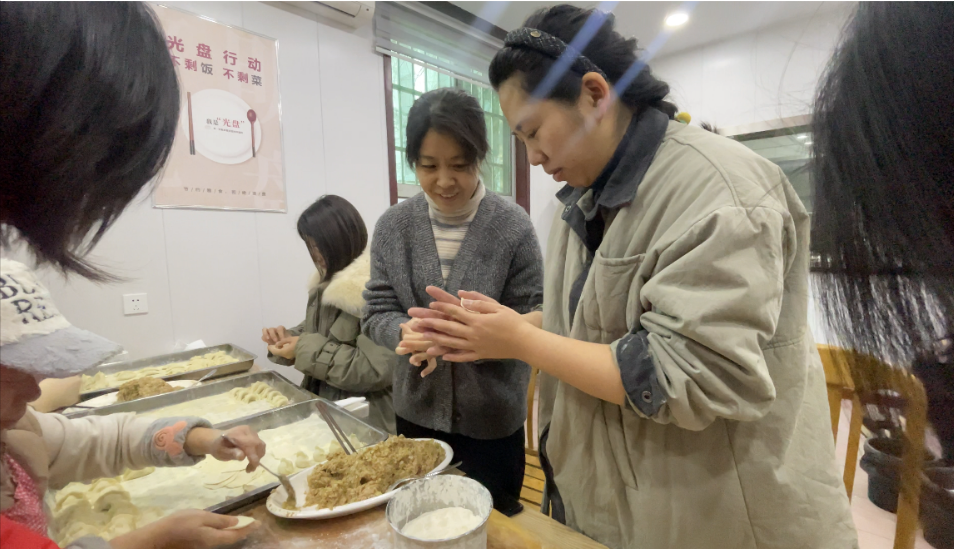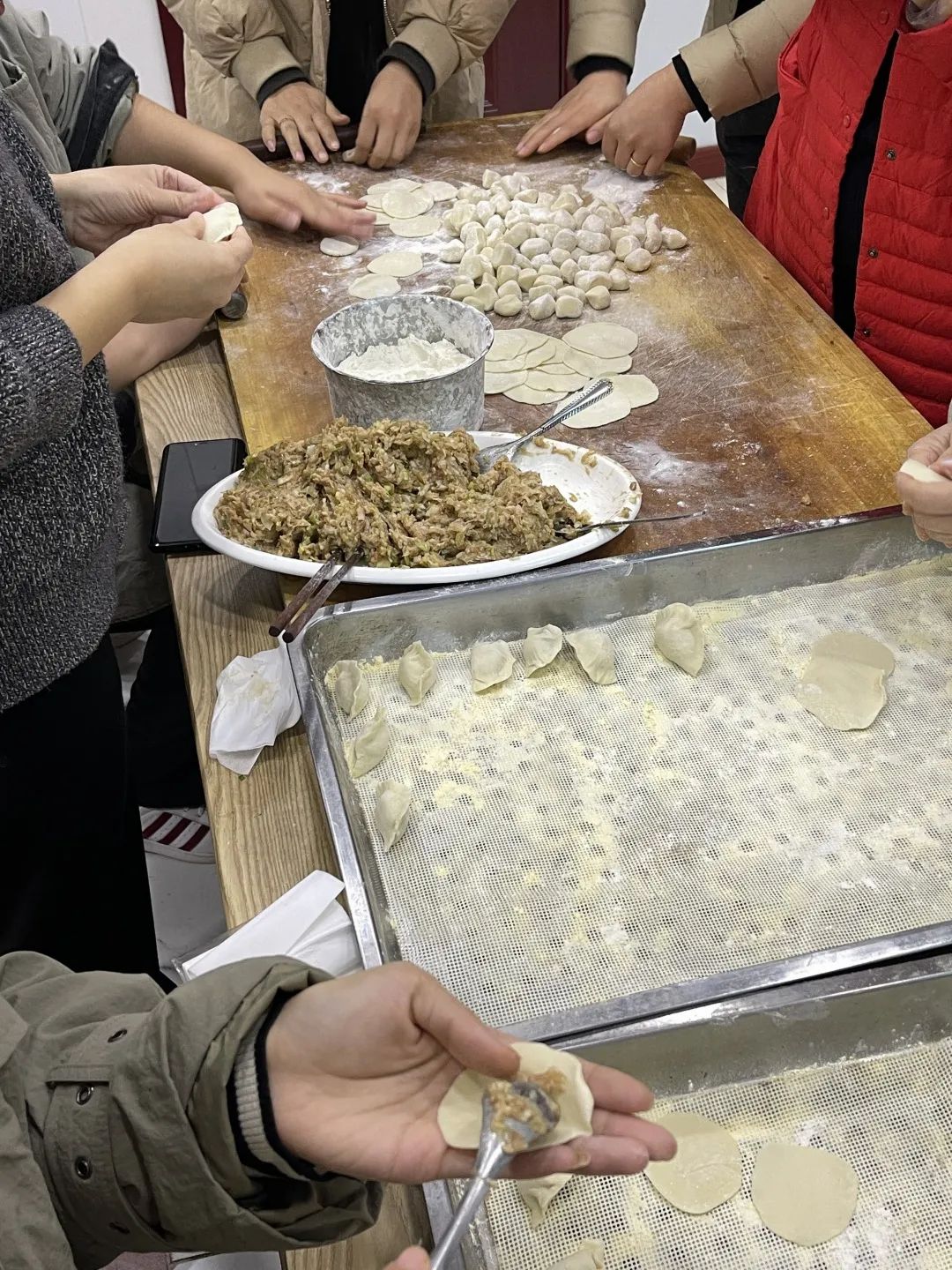大家一起圍在桌旁,分工有序、忙而不亂,互相交流著包餃子的技巧,歡聲笑語中各個大顯身手,現(xiàn)場氣氛和諧,到處洋溢著“家”的味道、“家”的溫馨。一番協(xié)作之下,一排排個性十足的餃子很快就包好了,屋外寒風(fēng)陣陣,屋內(nèi)歡聲笑語,暖意融融。