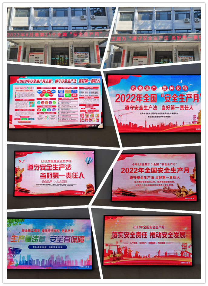 今年6月是全國第21個“安全生產(chǎn)月”,主題為“遵守安全生產(chǎn)法,當好第一責任人”。為做好今年“安全生產(chǎn)月”的宣傳工作。近日,我公司通過門頭電子屏滾動播放宣傳標語、室內(nèi)電子屏展示安全生產(chǎn)知識、微信群發(fā)放最新版《中華人民共和國安全生產(chǎn)法》,時刻提醒公司全體員工遵守安全生產(chǎn)法,履行安全生產(chǎn)責任制。